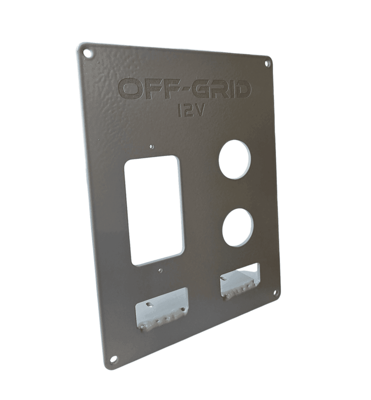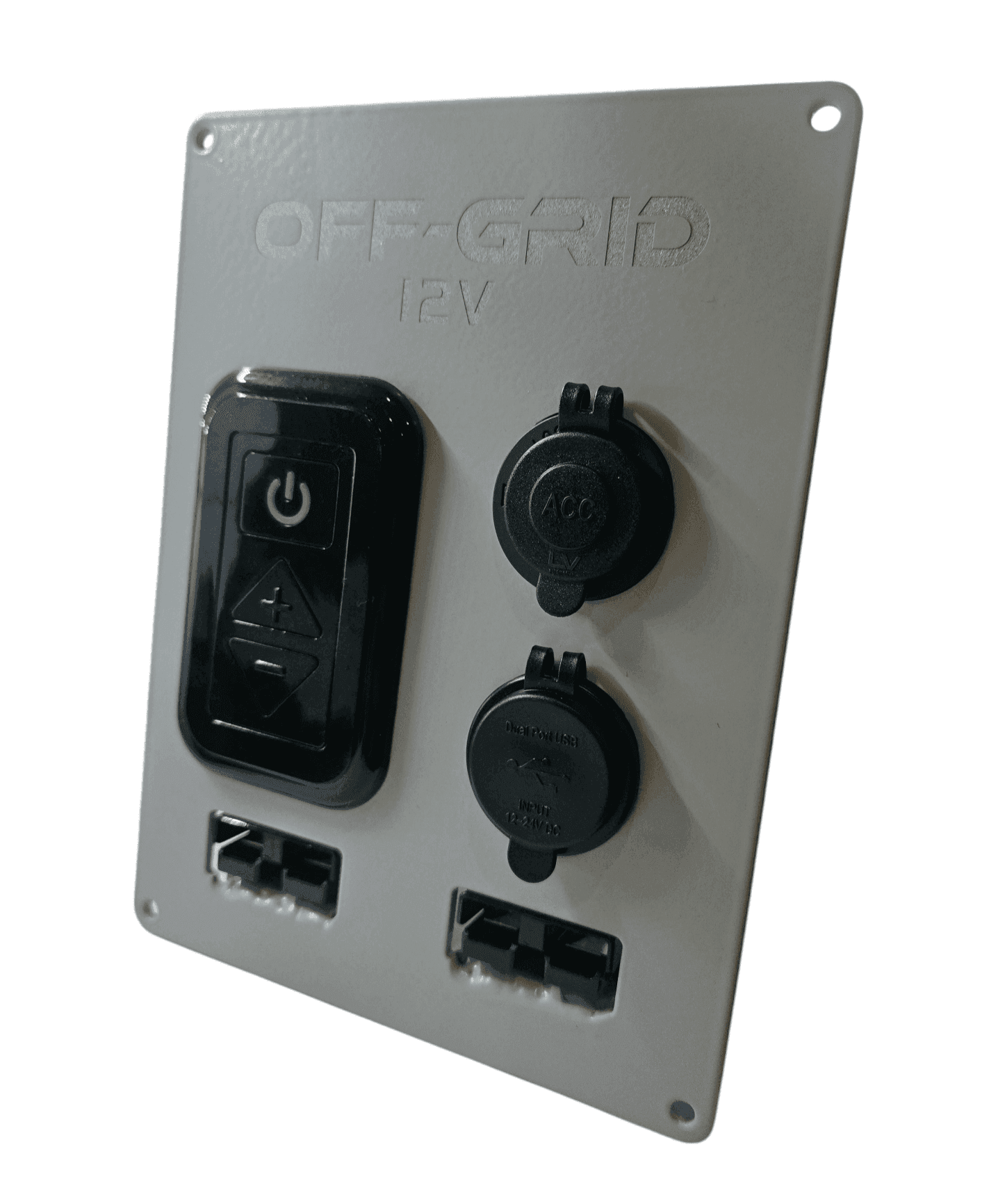 Discover our rugged 12V accessory panel, designed and built in Australia to withstand tough conditions. Available in multiple colours, it features slots for 50A Anderson plugs and customizable 12V sockets and suits the displayed LED dimmer switch. Perfect for mounting in canopies or vehicles. Buy pre-assembled or choose individual parts.